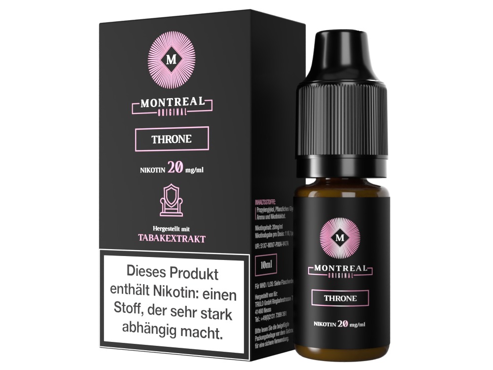 Montreal Original nutzt ein Verfahren zur Extraktion aus industriellen Tabakmischungen. Das Throne Liquid basiert auf dieser Methode. Das E-Liquid ist in 10 ml Einwegflaschen erhältlich. Die Herstellung erfolgt unter Berücksichtigung der geltenden Produktsicherheitsvorschriften.