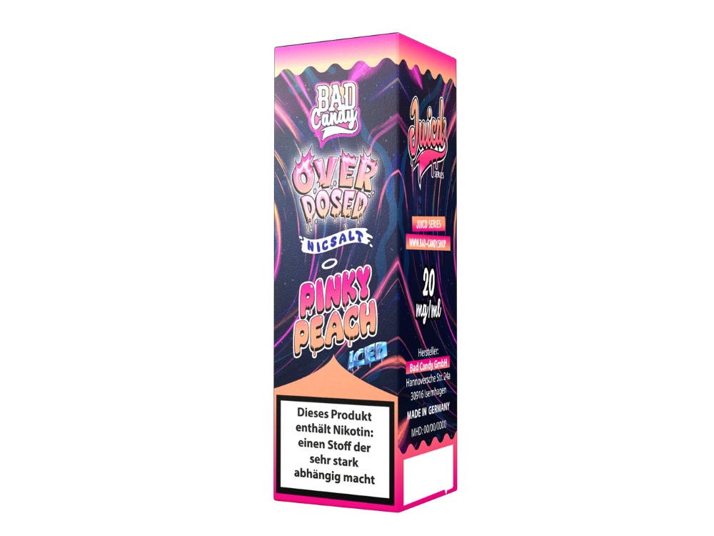 Das Nikotinsalz Liquid Pinky Peach von Bad Candy Liquids ist für den Einsatz in E-Zigaretten bestimmt. Das Produkt ist in einer 10 ml Flasche erhältlich. Es werden zwei Nikotinstärken angeboten.