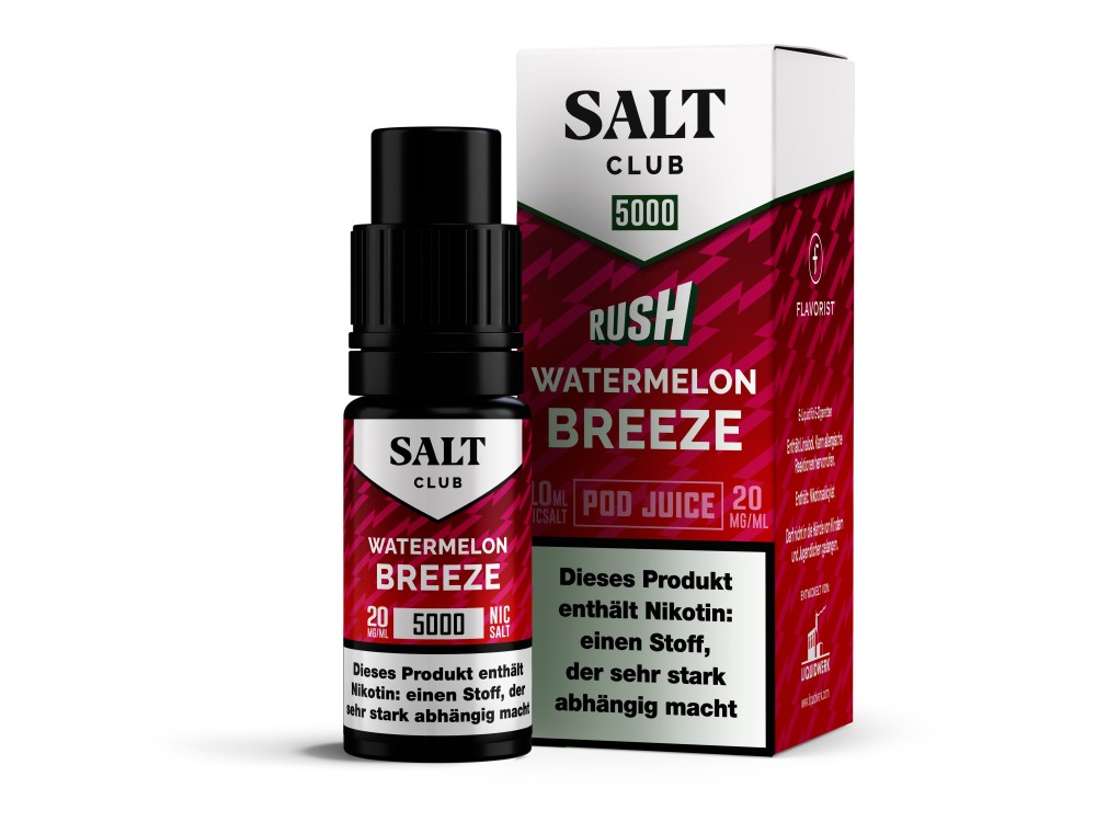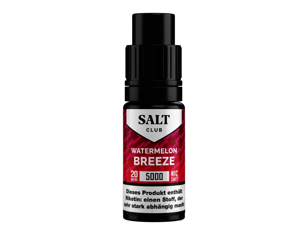 Das Nikotinsalz Liquid Watermelon Breeze von Salt Club ist ein gebrauchsfertiges Liquid für E-Zigaretten. Es ist Teil der 5000 Serie des Herstellers und wird in einer 10 ml Flasche geliefert.
