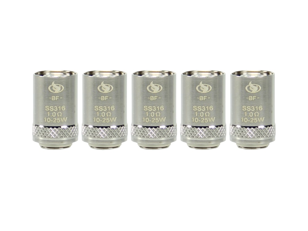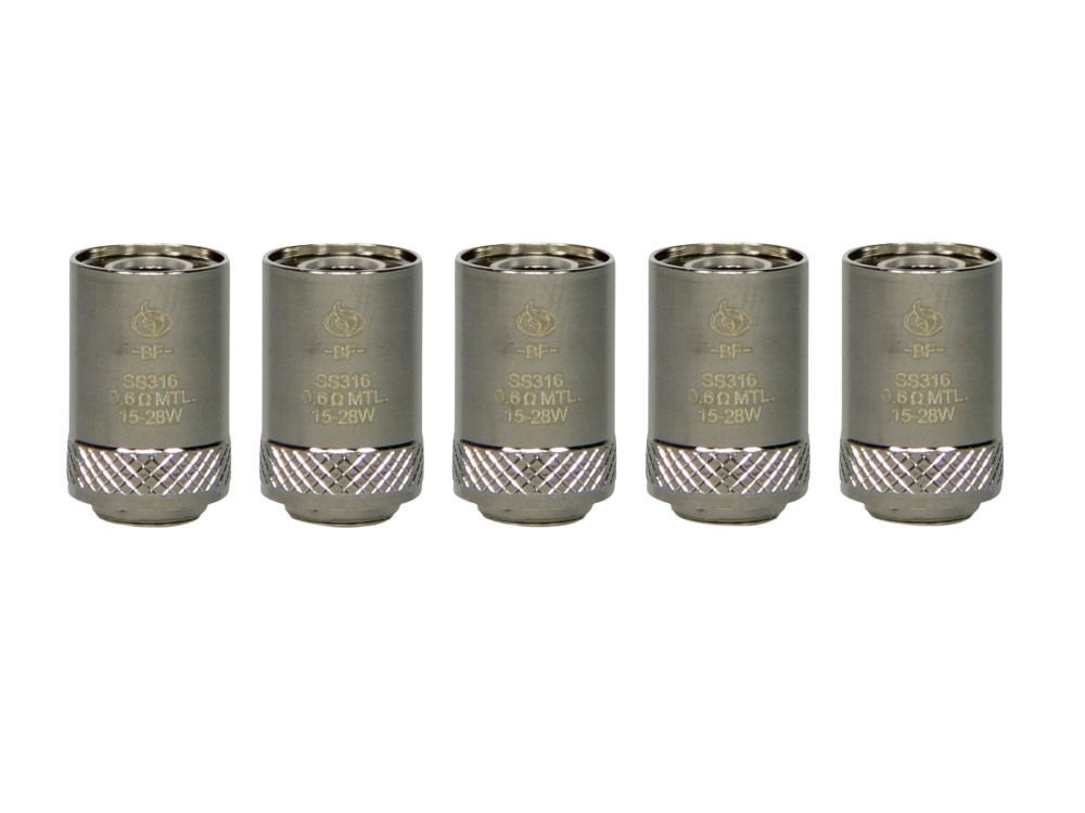 Jede Packung enthält fünf BF SS316 Heads. Die Auslieferung kann in verschiedenen Widerstandsvarianten erfolgen, darunter 0,5 Ohm, 0,6 Ohm und 1,0 Ohm. Das verwendete Material ist durchgehend Edelstahl der Qualität SS316. Die Widerstände sind verschiedenen Inhalationstechniken zugeordnet: Der 0,5-Ohm-Kopf ist für die direkte Lungeninhalation (DTL) vorgesehen, die 0,6-Ohm- und 1,0-Ohm-Varianten für die Mund-zu-Lunge-Inhalation (MTL).